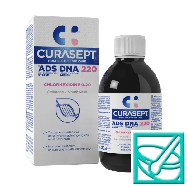 Tekućina za ispiranje usta Curasept ADS | DNA 220 nudi sveobuhvatnu podršku u liječenju desni nakon stomatoloških intervencija i kod teških upala desni. Klorheksidin i ADS sustav, bez alkohola. Održava zdravlje usne šupljine i bjelinu Vaših zubi.